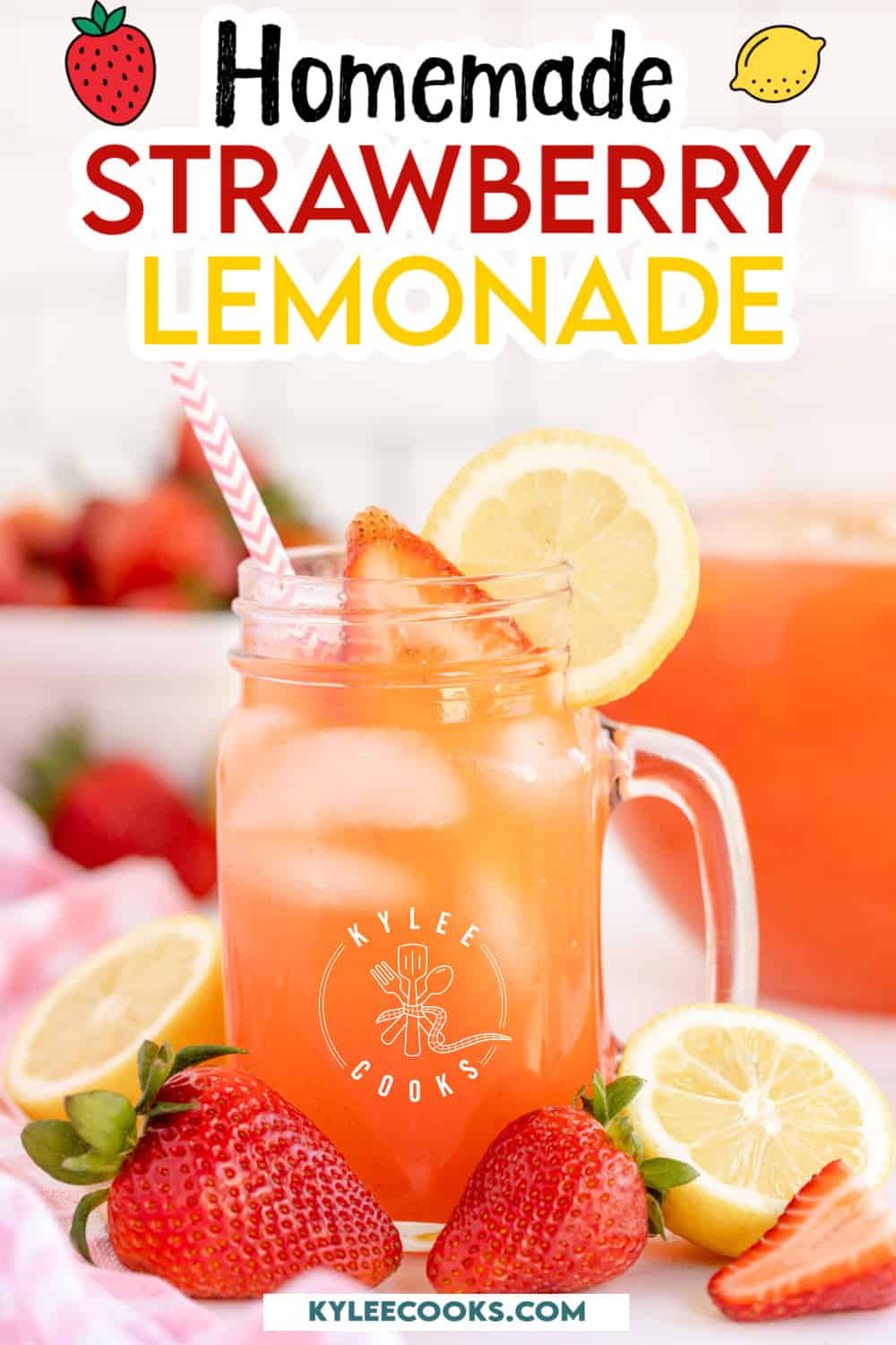 Juice the lemons, and add to a large pitcher. In a blender or food processor, add the strawberries and 1 cup of water and blend until smooth.
